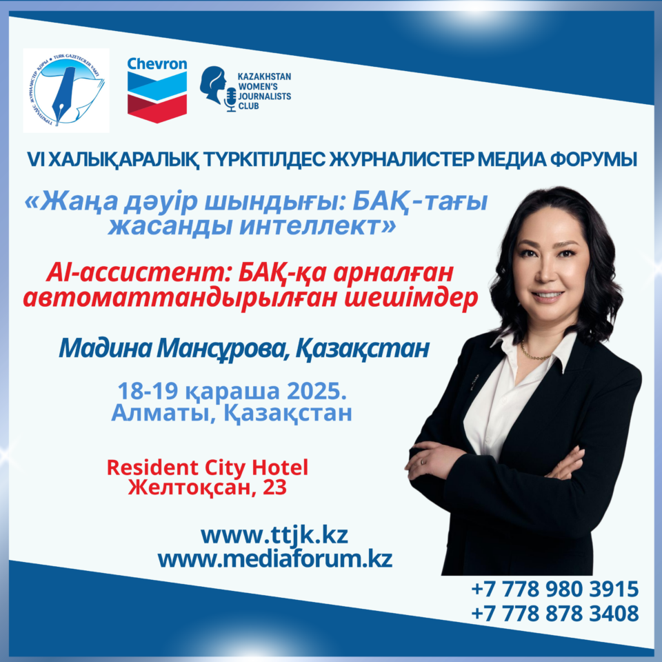VI Халықаралық түркітілдес журналистер медиафорумындағы «Жаңа дәуір шындығы: БАҚ-тағы жасанды интеллект» тақырыбындағы отырыста «AI ассистент: БАҚ-қа арналған автоматтандырылған жүйе» тақырыбына баяндама жасайтын Мадина Мансұрова журналистердің жүгін жеңілдетуге септігін тигізетін дүниелер жайлы айтады.