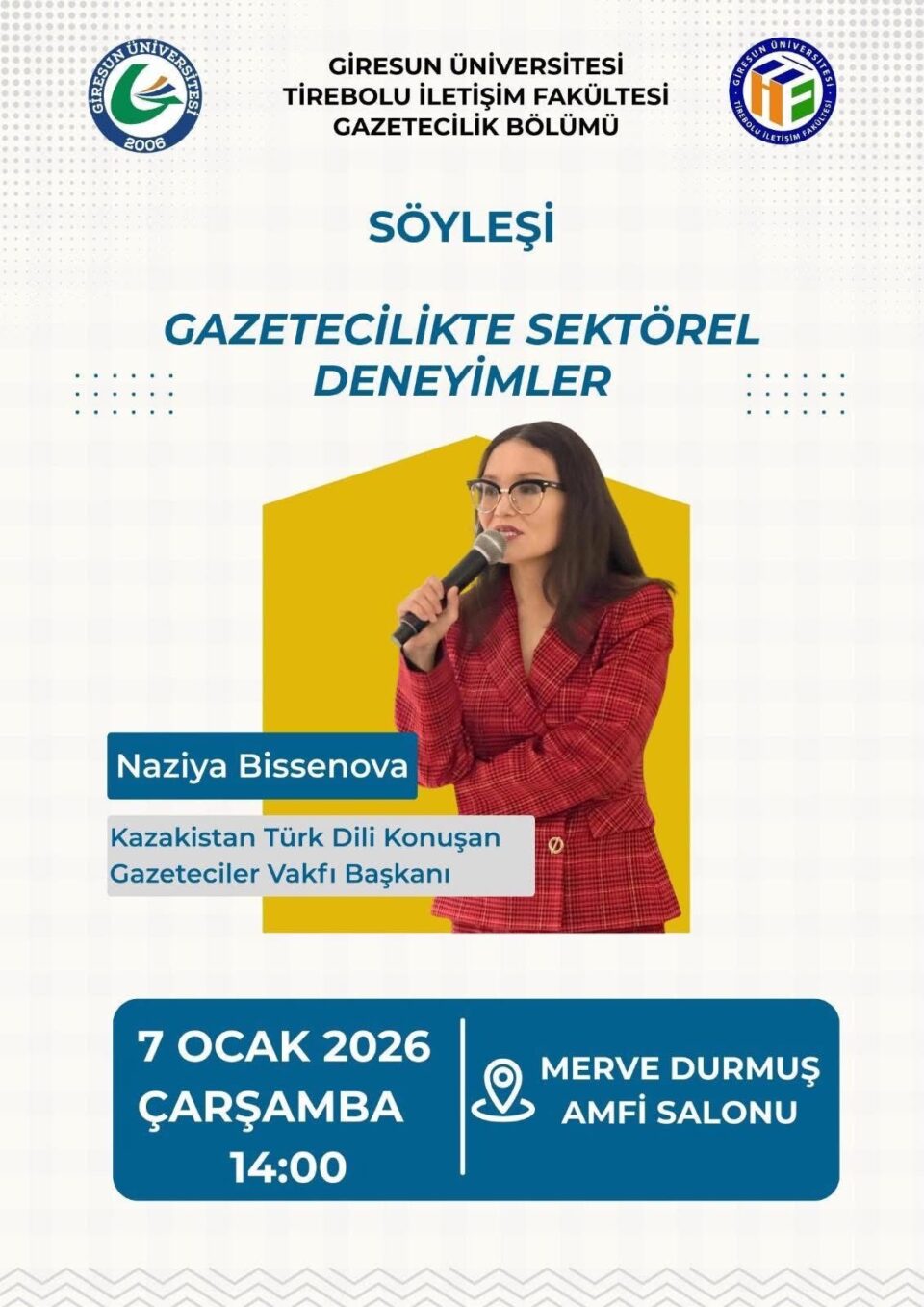 2026 жылдың 7 қаңтарында Түркітілдес журналистер қорының президенті Нәзия Жоямергенқызы Гиресун университетінің Тиреболу Журналистика факультетінің студенттерімен кездесіп, Қазақстан географиясы, туризмі, Түркітілдес журналистер қоры, Әйел журналистер клубы, Жас журналистер мектебі туралы баяндама жасайды.