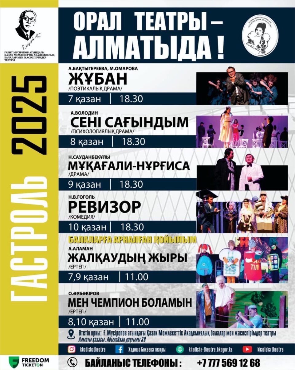 Аталмыш ұжым 2025 жылдың 7,8,9,10 қазан күндері Алматы қаласында гастрольдік сапарда болады. Өнерсүйер қауымға театр репертуарындағы таңдаулы классикалық, әлемдік және заманауи драматургиядан үздік қойылымдарын және кішкентай көрермендерге арналған ертегілерінұсынады. Сонымен қатар биылғы жылы рухты ақын Жұбан Молдағалиевтің 105 жылдығы мен Нұрғиса Тілендиевті 100 жылдығы аясында тұлғалардың асыл мұрасын насихаттап, жас буынға елдік рух пен мәдени құндылықты жеткізу мақсатында қойылған спектакльдер де бар. Әр қойылым – сахнадағы шынайы сезім, актерлік шеберлік пен көркемдік ізденістің тоғысы.